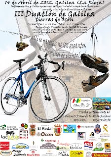 Nos encanta el deporte y hoy tenemos el placer de anunciaros que somos colaboradores de la tercera edición del Duatlón de Galilea «Tierras de Ocón». La fecha elegida es hoy 14 de abril de 2012. Como en ediciones anteriores la mañana estará dedicada a pruebas escolares integradas en los Juegos Deportivos de La Rioja, teniendo lugar la prueba absoluta a las 16:00 horas. Las distancias son las mismas que en ediciones anteriores, es decir, 5k – 20k – 2,5k.